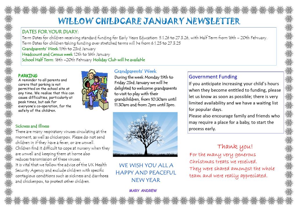 Grandparents’ WeekMonday 19, January, 2026 to Friday 23, January, 2026We welcome grandparents to visit to play with their grandchildren, from 10.30am until 11.30am and from 2pm until 3pm.